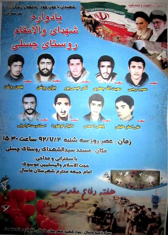 یادواره نه شهید والامقام روستای چسلی ماسال عصر سه شنبه همزمان با سومین روز از هفته دفاع مقدس در مسجد سیدالشهدای روستا برگزار می شود